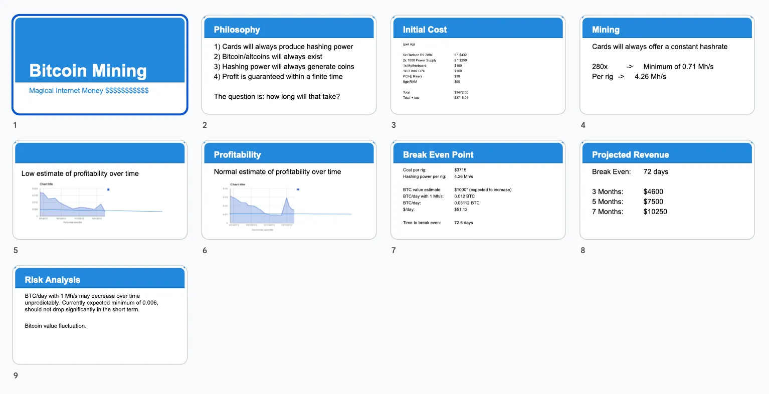 In the winter of 2013, I grouped up with a few of my friends with a scheme to make magic internet money. I even put together “business slides” to get everyone in on it.